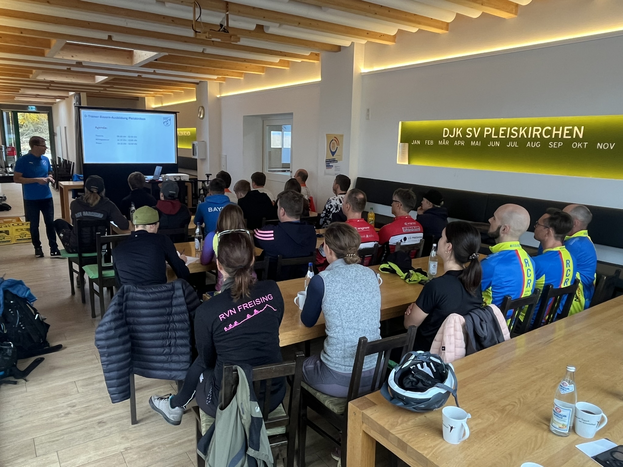 Stützpunkttrainer Harald Sterzl begrüßte insgesamt 27 Jugendbetreuer im Alter von 15 bis Ü50 Jahren aus den umliegenden Vereinen (Pleiskirchen, Marktl, Töging, Neuötting, Garching, Freising und weitere). Dabei hat der Leiter Harald Sterzl, der die Ausbildung zum A-Trainer im Radsport besitzt, den Teilnehmern im theoretischen Teil vermittelt, auf was alles zu achten ist: von Pannenhilfe über Notfallbehandlung bis zur Fahrrad-Technik war alles dabei und für die Lehrgangs-Teilnehmer war das eine oder andere neu.