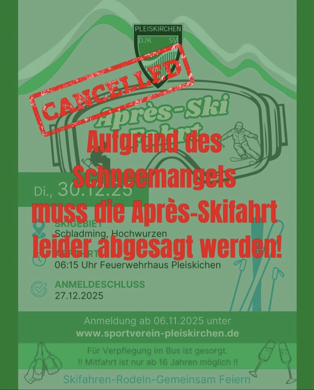 Leider muss die geplante Après-Ski-Fahrt am Dienstag, den 30.12.2025, nach Schladming–Hochwurzen abgesagt werden.